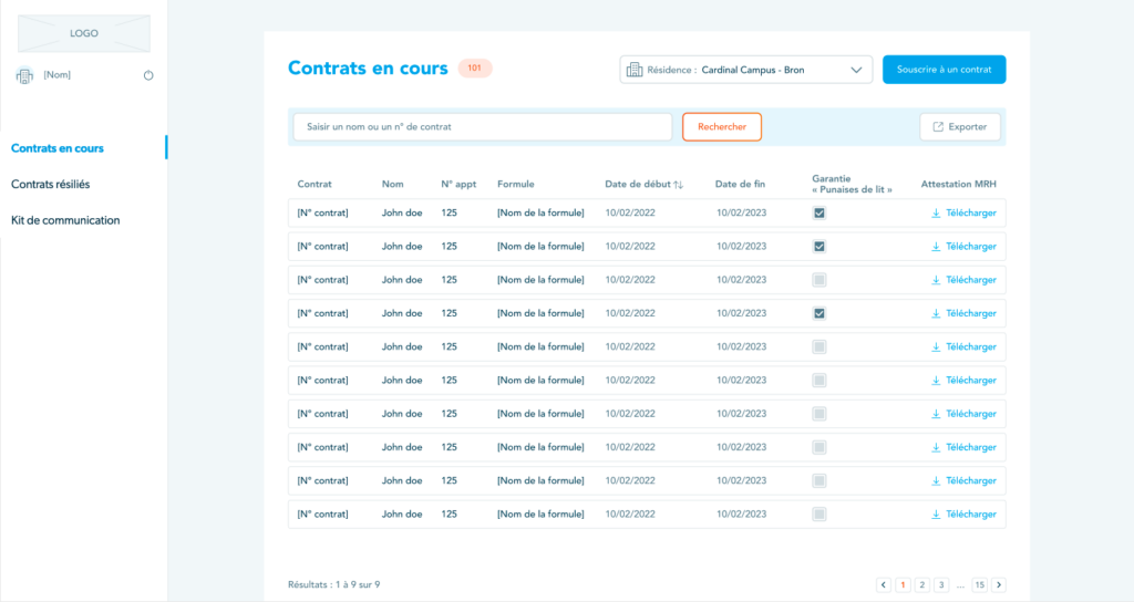 L’espace client, généré après la souscription, regroupe toutes les fonctionnalités nécessaires pour gérer son contrat d’assurance. Cet espace permet de visualiser le contrat, d’accéder à tous les documents associés, de renouveler le contrat à son échéance, ou encore de le résilier. Il offre également la possibilité d’ajouter un colocataire au contrat.